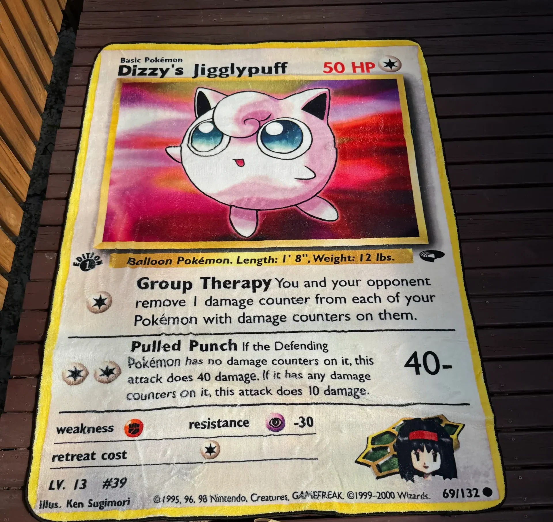 This unique rug recreates the classic Jigglepuff Pokémon card with owner’s name. It features the complete card art, text, and border woven into a smooth , low-pile fabric with vibrant colors. A nostalgic piece that brings gaming nostalgia to home decor, perfect as a gift. (Fabric: cashere like)