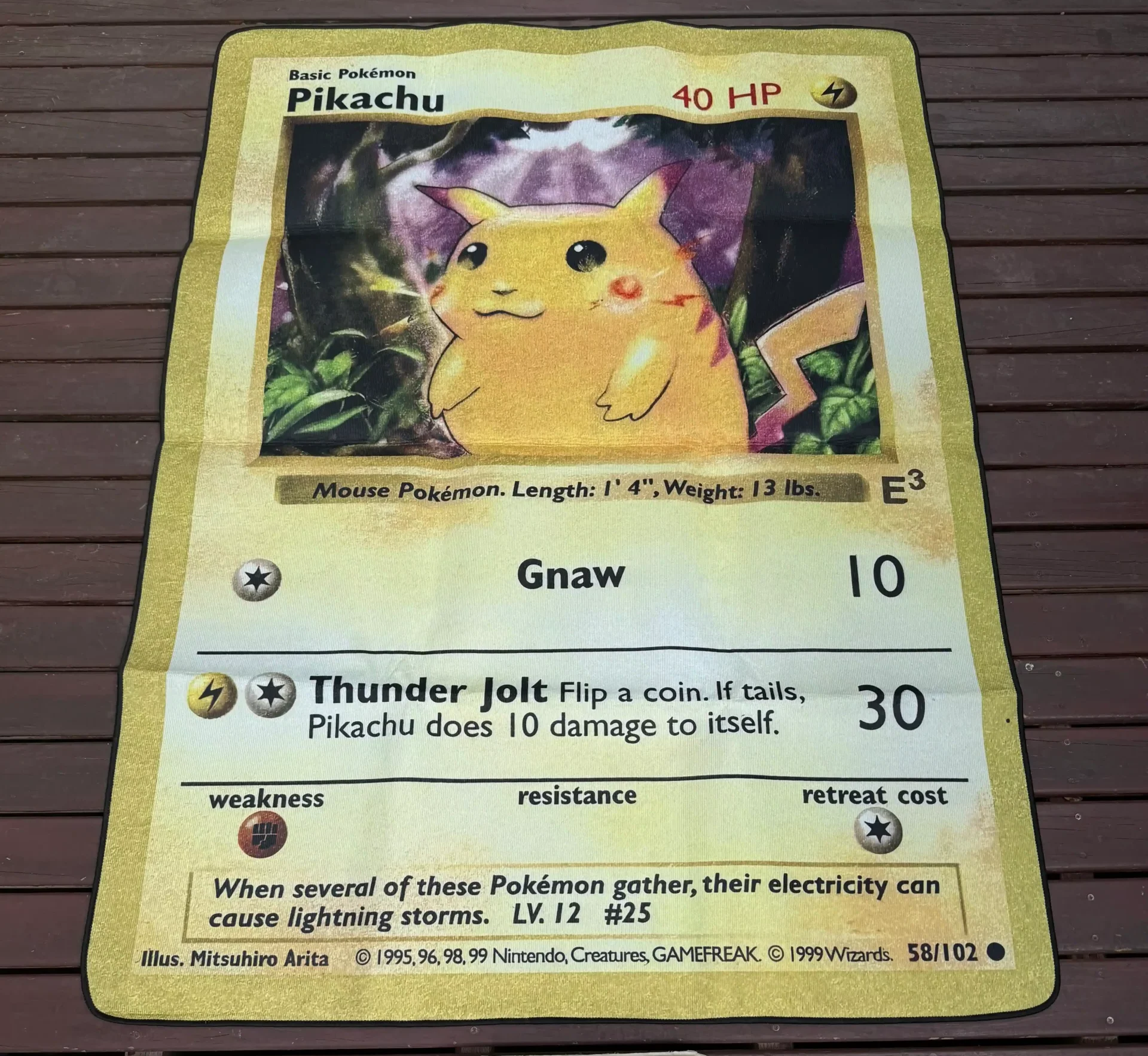 This unique rug recreates the classic Pikachu Pokémon card. It features the complete card art, text, and border woven into a smooth , low-pile fabric with vibrant colors. A nostalgic piece that brings gaming nostalgia to home decor, perfect as a collectible accent. (Fabric: crystal velvet)